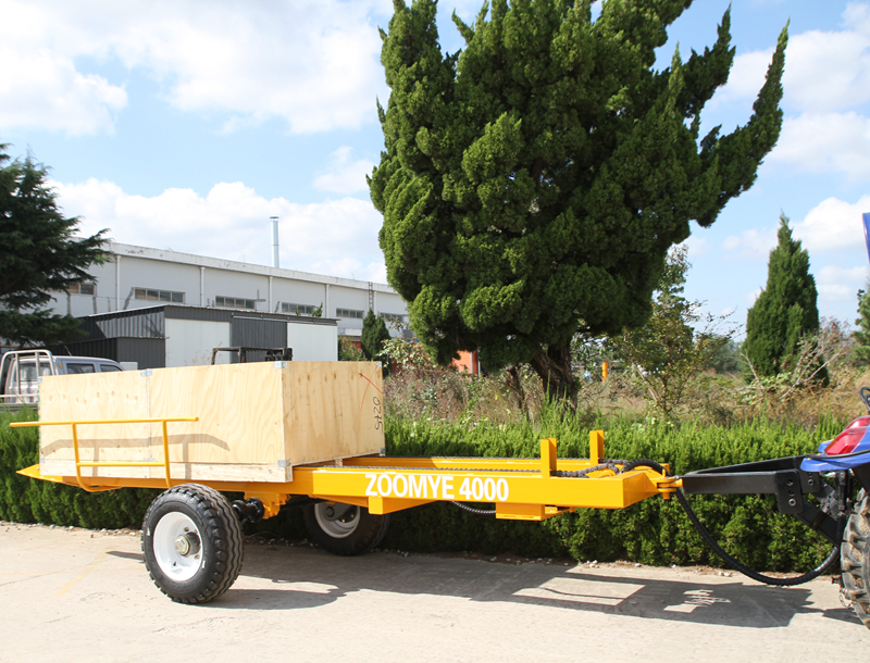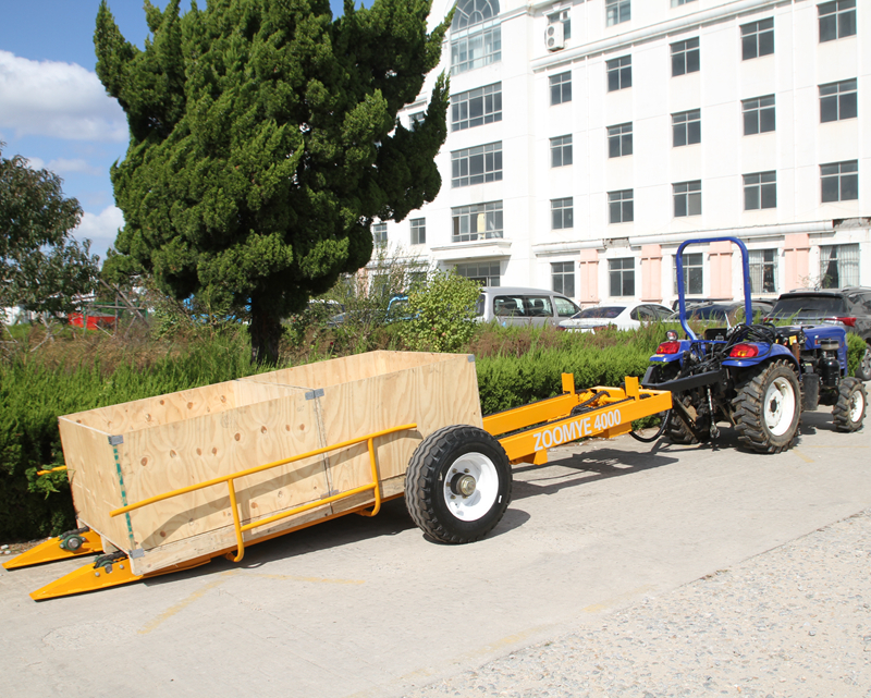 The chassis lifting fruit basket trailer is a smart transport equipment developed by CEA to solve the problem of modern orchard turnover of large standard fruit baskets (such as transportation and distribution of empty fruit baskets and recycling of fruit baskets full of fruits). The trailer is used together with the tractor. The trailer axle can be lifted and lowered under the action of the hydraulic oil cylinder (the lifting range can be customized). The duckbill fork head at the end of the frame longitudinal beam with the hydraulic hinge device can fit perfectly to the ground under the action of the oil cylinder, and it is easy to fork into the bottom of the fruit basket. At this time, the fruit basket is hinged to the truck by the hydraulic hinge. The trailer can load 3-5 standard fruit baskets at a time (the length can be customized), which is a good way to transfer fruit baskets other than backpack forklift.